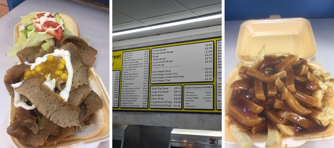 Derby Street Chippy specializes in classic fish and chips, but the menu also includes sausages, steak puddings, burgers, chicken, and meal deals. You can find favorites like doner wraps and chicken wraps.